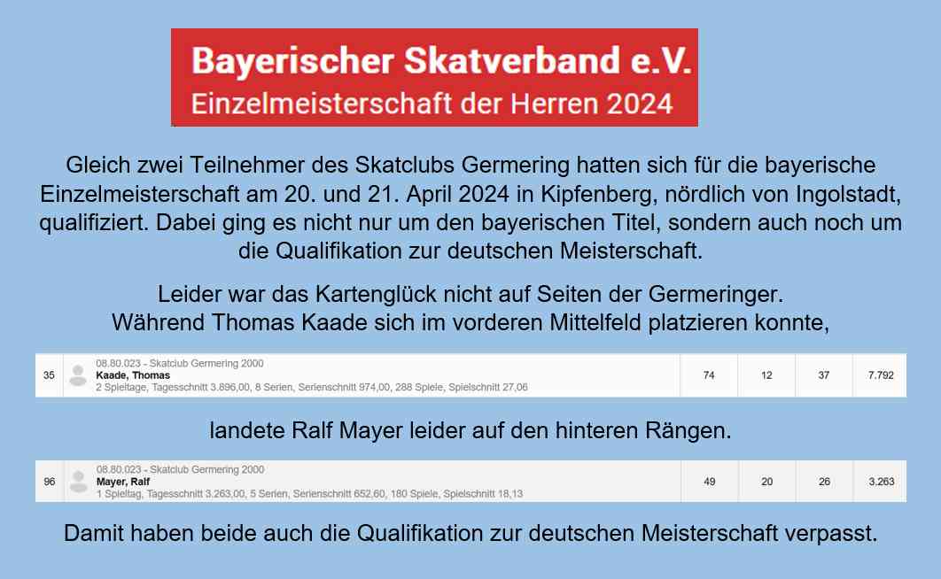 In der Einzelwertung landete Ralf Mayer im Mittelfeld, aber sowohl Sigi Miksch auf Platz 21 als auch Thomas Kaade auf Rang 17 platzierten sich in den Preisrängen, Turniersieger wurde Franz Rockinger, der sich in der letzten Serie knapp gegen seine Konkurrenten durchsetzen konnte.