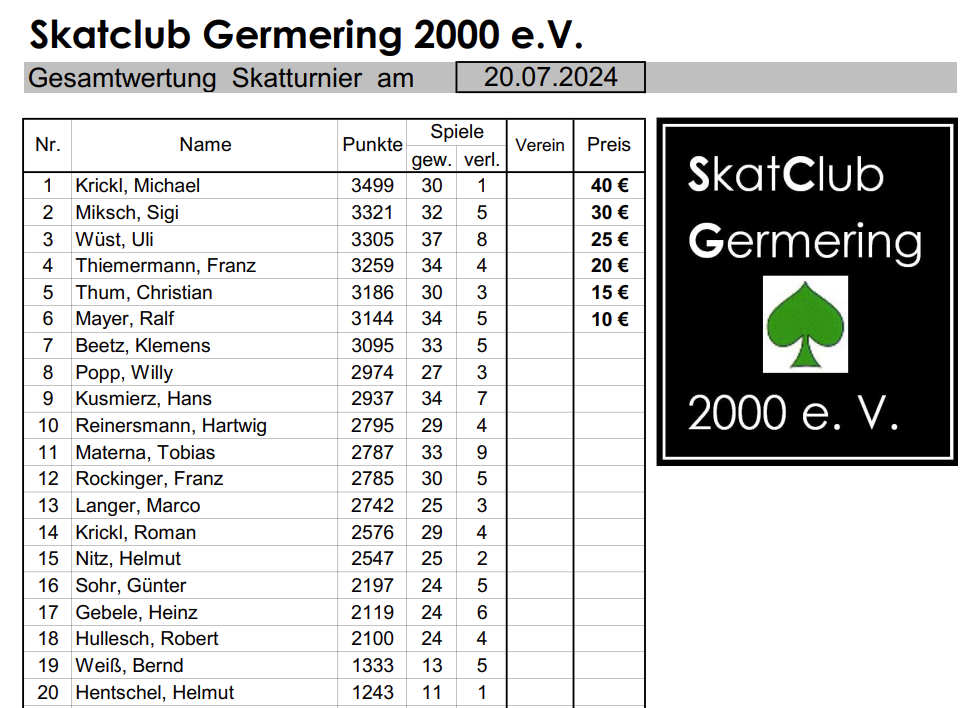 Am Samstag den 20. Juli 2024 trafen sich 20 Spieler des Skatclubs Germering zum Sommerskatturnier